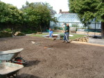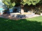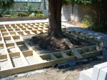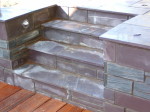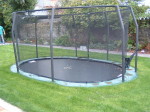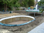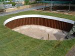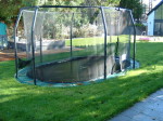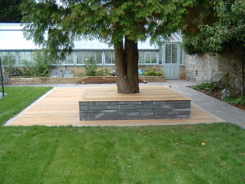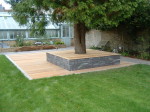A large timber seating area was constructed around the trunk of an existing red western cedar tree – perfect for a bit of shade on a sunny day. To install the sunken trampoline pit we excavated down 1.9 metres, installed a drainage system, timber retainers and a damp proof course before the positioning the trampoline inside so that the bounce line was level with the lawn. Finally we dressed the walls, steps and pathways with over 20 tonnes of welsh slate and reinstated the lawn using new, nursery grown weed free turf.